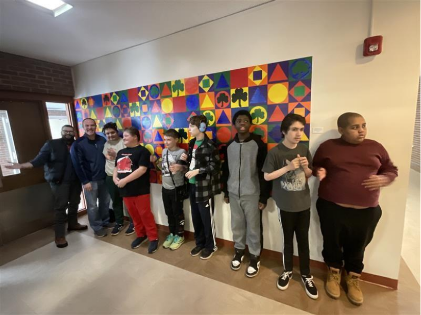 During fall 2025, the Elizabeth Lee Black School collaborated with Erie Arts & Culture on an Arist in Residence program featuring mural artist Steve Mik. Steve Mik is a local artist who has been painting murals for the last 15 years. He has a passion for working with community and inspiring people using public art. Working with four of our classrooms, Steve guided students in creating a symphony of color and geometry, a rhythmic medley of shapes that transforms a simple hallway into a gallery of imagination. Squares, circles, triangles, and clovers march in harmonious rows, each block a bold declaration of red, blue, yellow, and green. The repetition feels like a visual heartbeat—steady yet full of surprises—where familiar forms become playful patterns. An official unveiling of the mural occurred on December 16. Steve, along with members from Erie Arts & Culture, joined the celebration. The mural is a kaleidoscope of possibilities, inviting every passerby to pause and see the beauty in order, color, and joy.