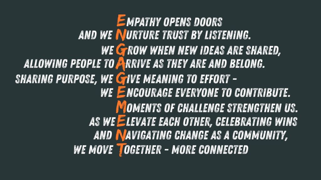 Engagement begins with a connection. By fostering meaningful relationships among students, families, staff, and community partners, the school creates an environment where individuals feel seen, valued, and included. These connections are not incidental; they are purposefully cultivated through shared experiences, open communication, and opportunities for collaboration that extend beyond the classroom. When people feel they belong, they are more likely to invest their time, talents, and perspectives in ways that enrich the entire community.