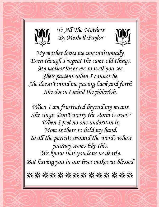 Happy Mother’s Day on Sunday to all the mothers out there. Below is a poem written by Meshell Baylor that shares the sentiment of love a child with autism feels from his or her mother.