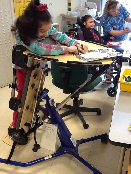 A prone stander helps Enji complete schoolwork